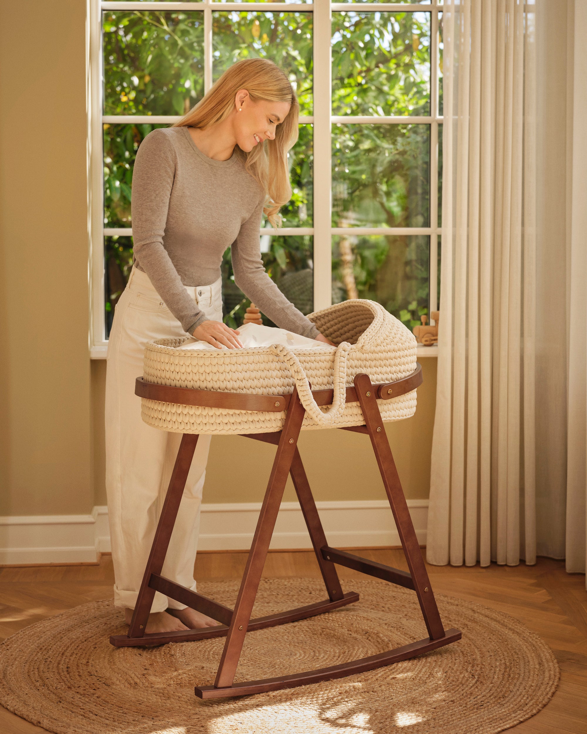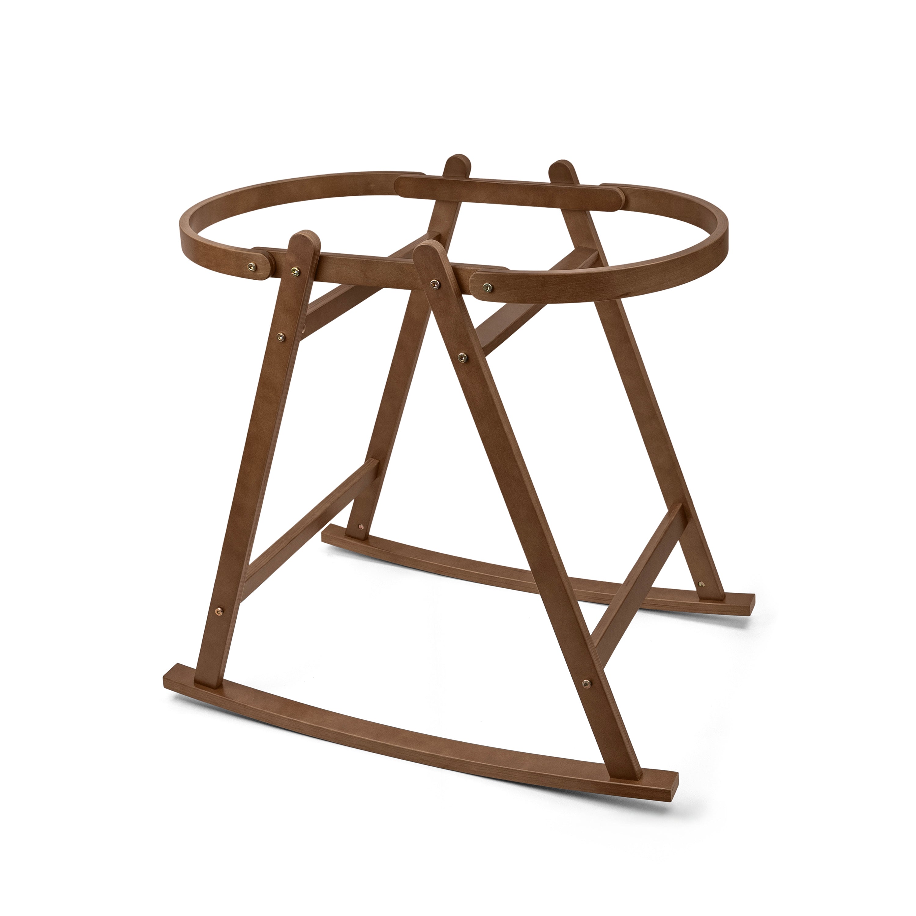 Made to securely hold the crocheted moses basket, the stand adds gentle rocking to help soothe your baby to sleep. Its sturdy design and warm walnut finish bring comfort and a complete look to your nursery.